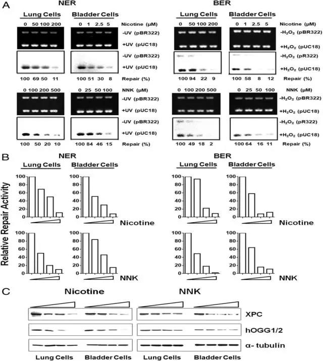 尼古丁和NNK降低了体外人肺和膀胱上皮细胞中的DNA修复活性和修复蛋白XPC和hOGG1 / 2水平