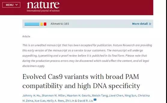 哈佛大学的化学生物学家David Liu领导的研究团队设计出一种称为xCas9新酶,可更多更有效地修改基因组中的位点,进而提高CRISPR-Cas9的效用,同时还可降低脱靶风险。这项研究结果以《Evolved Cas9 variants with broad PAM compatibility and high DNA specificity》为题发表在2月28日的《Nature》上。