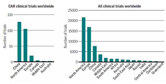 ▲CAR-T细胞疗法临床试验的全球分布(图片来源:《科学》)