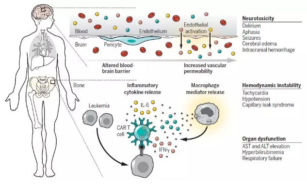 ▲CAR-T细胞疗法的副作用:细胞因子释放综合症和神经毒性(图片来源:《科学》)