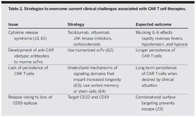 大多数复发性白血病患者在CD19特异性CAR-T细胞治疗后获得完全缓解。但出现了两种形式的抗性。在急性白血病患者中,CD19抗原表位的缺失是肿瘤逃逸的主要机制。在针对青少年和小儿急性白血病患者的临床试验中,CD19表达阴性的患者复发率为28%。在慢性淋巴性白血病(CLL)中,尚无报道发现CD19缺失产生耐药,CLL的耐药性可能是由于细胞输注后CAR-T细胞不能增殖。表2列出了CAR-T细胞疗法在临床治疗中需要克服的几个重要挑战。