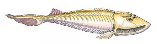5亿年前 最早的脊椎动物甲胄鱼出现,这是一种无腭鱼,与现今的八目鳗和盲鳗类似。
