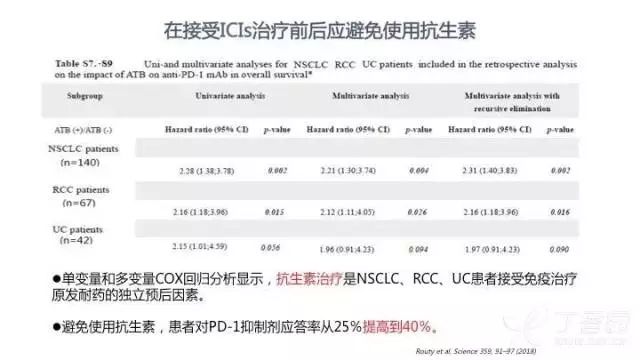 单变量和多变量 COX 回归分析显示,抗生素治疗是 NSCLC、肾细胞癌、尿路上皮癌患者接受免疫治疗原发耐药的独立预后因素 [15]。避免使用抗生素,患者对 PD-1 抑制剂的应答率可从 25% 提高到 40%。因此,在使用免疫治疗前后,应尽量避免使用抗生素。