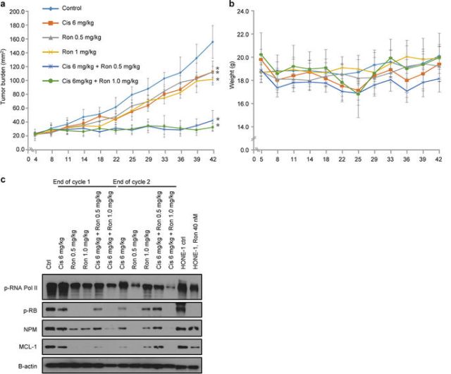 随后,研究人员又进行了体内实验,实验表明小鼠对roniciclib的耐受性良好,并且与用6mg / kg顺铂治疗相比有效地抑制了肿瘤生长,而将这两种药物组合产生的肿瘤抑制远大于任一单一治疗(如图3 )。