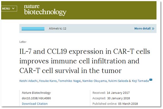 | 导读 | 最新一期国际著名学术期刊《自然-生物技术》在线发表了一篇关于免疫治疗肿瘤的重磅文章,一组来自日本的科学家团队通过将IL-17以及CCL-19基因转入CAR-T细胞制备出能够有效杀伤肿瘤的“超级CAR-T细胞”,这种细胞在体内存活时间更长并且能够有效地帮助DC细胞以及T细胞浸润到肿瘤组织内部一起杀伤肿瘤。 |