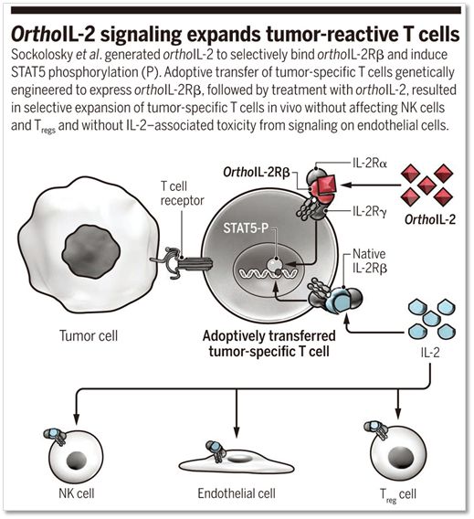 ▲《科学》杂志同期评论文章的示意图,将orthoIL-2Rβ在过继性T细胞疗法比如CAR-T细胞中表达,这样一来,T细胞表面的orthoIL-2R(其胞内的结构域仍然保留)只能够与orthoIL-2结合而不能与正常的IL-2结合,从而刺激T细胞中的STAT5的磷酸化,从而促进T细胞增殖及维持其活性(图片来自Science)