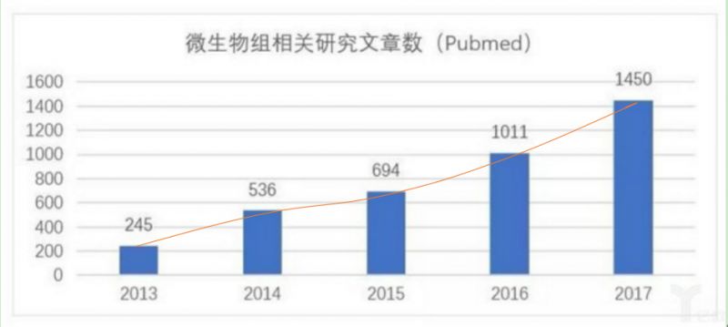 根据统计,Pubmed收录的微生物组相关文章逐年升高。从2016年开始明显加速,与2013年相比,达1011篇,增长413%。2017年达到1450篇,相比增长592%。