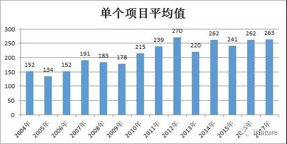 最后我们看了历年单个项目平均值,随着时间的推移,单个项目的平均值是有不断增加的趋势,从2006年的152万逐渐上升到2017年的263万,增长幅度非常的大(如图5)。