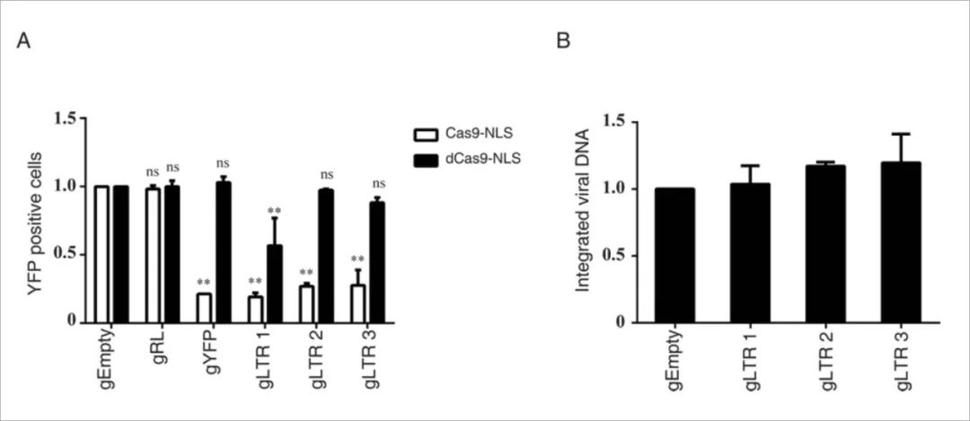 Cas9含有两个核酸酶结构域HNH和RuvC,它们是Cas9切割两条DNA链所必需的,接下来测试了非切割活性的Cas9-NLS(dCas9-NLS,D10A和H840A)对HIV-1的抑制能力。结果显示,当与HIV-1特异性gRNA共同作用时,dCas9-NLS不会抑制HIV-1感染,除了gLTR1靶向HIV-1 tat响应性茎环结构(TAR)并适度减少HIV-1感染。这可能是dCas9 / gLTR1与转录起始位点结合并阻断RNA聚合酶启动转录的结果。进一步实验表明整合病毒的DNA的水平在表达dCas9-NLS / gRNA的细胞中不受影响。这些结果表明核酸酶活性对于Cas9抑制HIV-1感染至关重要。