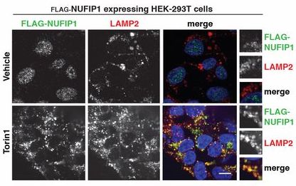研究在293T细胞中使用mTOR1抑制剂Torin 1时发现,使用抑制剂并没有影响NUFIP1的总量,但是影响了其细胞定位(下图)。