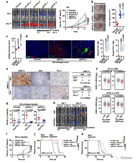 同一基因小鼠ARID1A缺乏的卵巢癌细胞株形成的肿瘤,突变量增加,肿瘤浸润淋巴细胞数增加,pd-L1表达增加。值得注意的是,抗pd-L1抗体治疗可降低小鼠的肿瘤负担,延长小鼠的存活时间,但不能抑制ARID1A野生型卵巢肿瘤的发生。这些结果表明ARID1A缺陷可能导致肿瘤MMR和突变表型受损,并可能与免疫检查点阻断治疗有关。