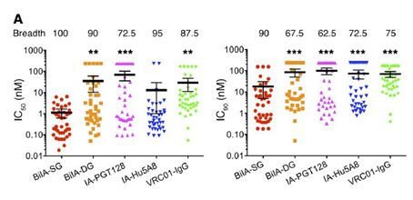 首先,研究小组挑选4个靶向HIV-1不同表位的抗体(PG16, PGT128, VRC01, Hu5A8)进行修饰表达,并把4个抗体进行联合使用,结果显示IA-PGT128 (gp120表位)和IA-Hu5A8(CD4表位)联用后有最强的中和效果。因此,研究人员选取这两个抗体来制备双特异性抗体BiIA-SG。在ELISA结合HIVCD4与gp120两个重组蛋白实验中,BilA-SG对两个重组蛋白均轻微减弱结合活性。