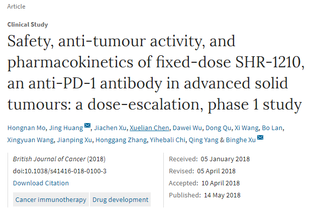 5月14日,发表在《英国癌症杂志》(British Journal of Cancer)上的临床研究结果显示,国内药厂恒瑞研发的新PD-1药物SHR-1210在治疗多种实体瘤上均有效,部分胃癌和膀胱癌患者达到完全缓解。