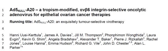 Hanni Uusi-Kerttula, James A. Davies, Jill M. Thompson. Ad5NULL-A20 – a t ropism-modified, αvβ6 integrin-selective oncolytic adenovirus for epithelial ovarian cancer therapies
