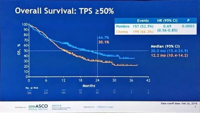 KEYNOTE-042的研究结果在美国临床肿瘤学年会(ASCO)的全体大会上公布。这项关键的三期临床研究旨在评估肿瘤免疫检查点PD-1抑制剂帕博利珠单抗作为单药一线治疗局部晚期或转移性无EGFR/ALK驱动基因突变的非小细胞肺癌(NSCLC)的相关疗效。结果显示: