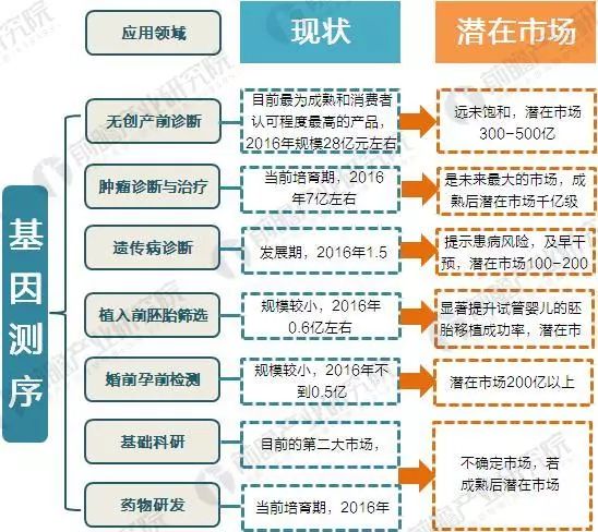 基因测序市场的应用主要集中在癌症诊断、产前DNA检测和遗传疾病检测等项目。比如产前DNA检测可通过对孕妇外周血的基因测序,了解到胎儿的基因情况,诊断胎儿的染色体是否有异常情况而导致一些临床疾病。