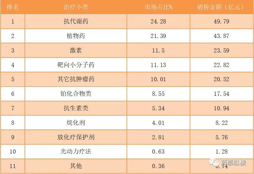 2017年各小类在抗肿瘤市场中排名及占比