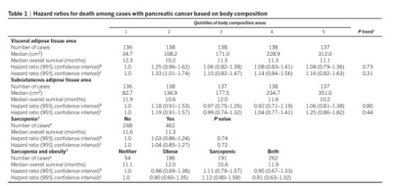 既然胰腺癌引起的消瘦与肿瘤本身消耗增多关系不大,那么胰腺肿瘤所致消瘦与肿瘤的存活率是否存在相关性呢?研究人员调查了美国肿瘤中心982名未被确诊的胰腺癌患者,测量其体重,观测其外周组织的消耗情况并与其最终的存活率进行了对比分析,结果发现肿瘤患者的外周消耗情况与最终的存活情况并没有太大的联系。