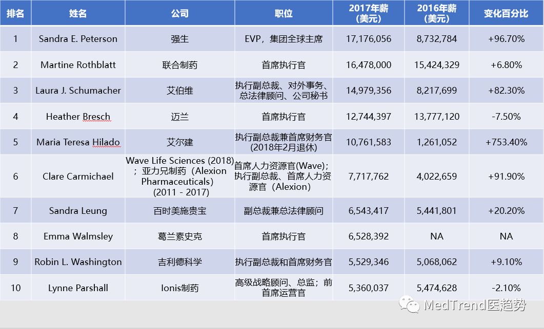 【薪酬】2017年全球制药行业年薪Top10女高管,强生Sandra近2千万 美金名列第一