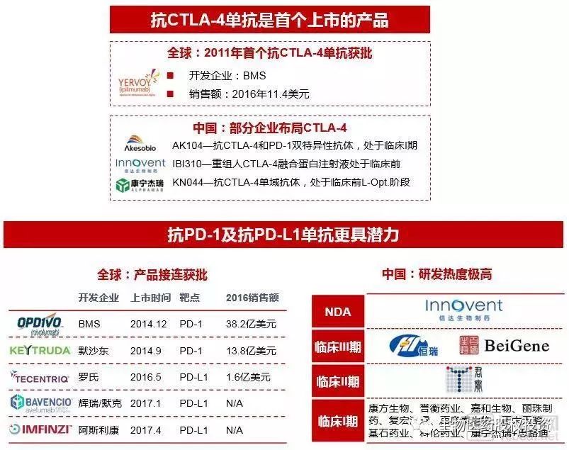 由于临床疗效显著、适应症可不断扩大、组合疗法丰富等原因,肿瘤免疫检查点抑制剂将有望成为未来5年最畅销的抗肿瘤药。截止目前,全球共有6款肿瘤免疫检查点抑制剂上市;在国内,PD-1和PD-L1是目前最热门的靶点,此外还有众多企业在CTLA-4、IDO、A2aR等靶点也进行了布局。