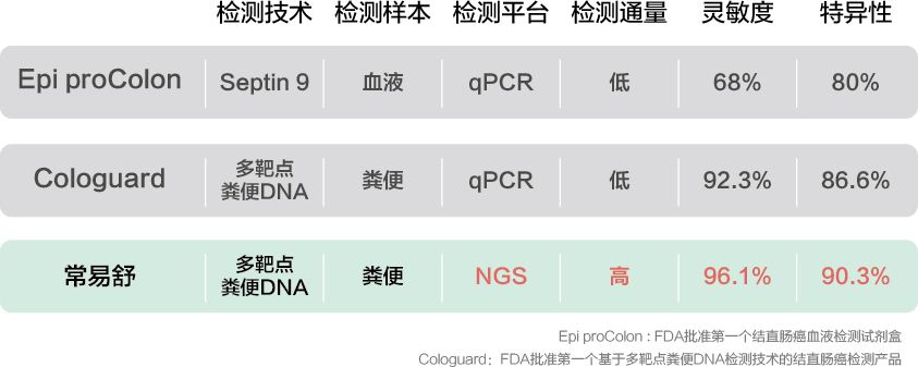 常易舒®对肠癌的总体灵敏度为96.06%,特异性为90.27%。常易舒®采用高通量基因测序技术,能够更全面的获取基因突变与甲基化位点信息,并综合多种分子指标,比市场同类肠癌筛查产品具备更高的灵敏度和特异性。