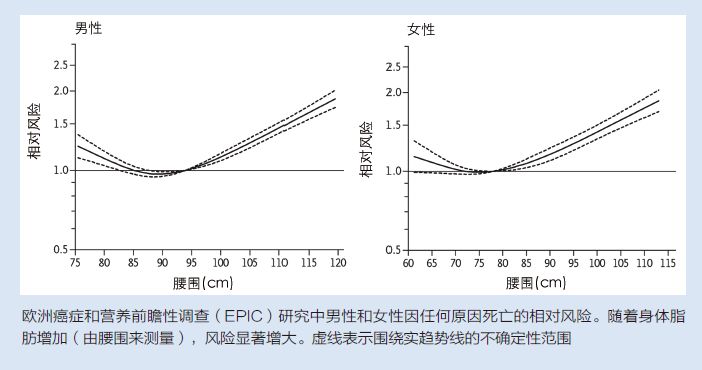 欧洲癌症和营养前瞻性调查(EPIC)更多研究结果除了结肠癌这项发现外,EPIC的另外两项成果与癌症预防有很大的关联性。身体脂肪[ 用身体质量指数(body mass index,BMI)来衡量] 以及腹部脂肪(由腰围或腰围与臀围比率)与任何原因导致死亡的相对危险性有明显的相关性。这个结果是源于所有的癌症、心血管疾病和呼吸系统疾病的死亡率的增加,并且这一发现在性别之间及国家之间都是一致的。