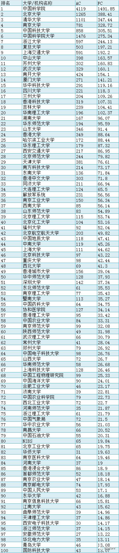 对于全球大学排名,我们发现,中国科学院已经连续多年盘踞着榜首的位置,哈佛大学及马克思普朗克学会紧随着其后。在全球大学前100名中,中国有16名大学/研究所进入其中,分别是:中国科学院(第1名),北京大学(第12名),清华大学(第15名),南京大学(第17名),中国科技大学(第20名),中国科学院大学(第28名),浙江大学(第33名),复旦大学(第48名),上海交通大学(第51名),中山大学(第61名),苏州大学(第65名),武汉大学(第67名),南开大学(第71名),厦门大学(第80名),华中科技大学(第95名),四川大学(第96名)等挺进前100强。有5所大学/研究所进入前20强,已经非常的不错,这也在侧面说明中国在基础研究领域快速的进步。另外,四川大学及华中科技大学顺利的挺进前100名,已经非常出色。