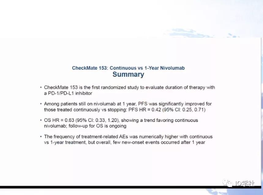 -Checkmate153研究显示继续用药比只用1年获益更多,具体用多久仍无答案。