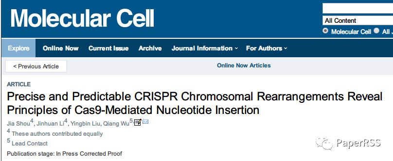 近日,上海交通大学系统生物医学研究院比较生物医学研究中心吴强教授课题组在国际著名期刊Molecular Cell《分子细胞》上在线发表了题为“Precise and Predictable CRISPR Chromosomal Rearrangements Reveal Principles of Cas9-mediated Nucleotide Insertion《精准且可预测的CRISPR染色体重排揭示Cas9介导的碱基插入规律》”的最新研究成果,在基因编辑机制方面取得了原始创新性进展,颠覆了已有的基因编辑认识。揭示了CRISPR/Cas9新一代基因编辑系统全新的切割机理及其在染色体重排和DNA修复中的作用,实现了精准的DNA大片段编辑及可预测的碱基插入。