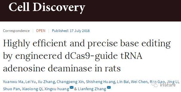 2018年7月17号,中国医学科学院北京协和医学院实验动物研究所张连峰课题组与上海科技大学黄行许课题组合作在Cell Discovery上在线发表了题Highly efficient and precise base editing by engineered dCas9-guide tRNA adenosine deaminase in rats”的研究论文。该报道了这种以中国新型的腺嘌呤碱编辑器在大鼠碱基编辑中的应用。研究表明,该系统是一种可靠的大鼠基因组编辑工具,与传统的CRISPR / Cas9系统相比,该系统以更安全的方式诱导碱基转化。同时,证明了该系统在纠正人类遗传疾病相关突变方面的潜力。这也是黄行许课题组继2018年6月6号在Cell Research和2018年3月19号在Nature Biotechnology发表的相关文章后的又一重大突破。