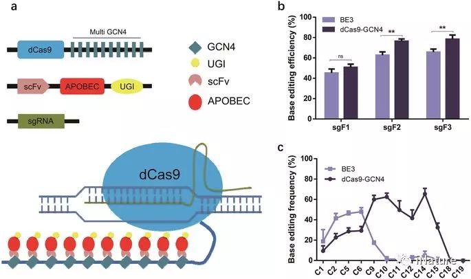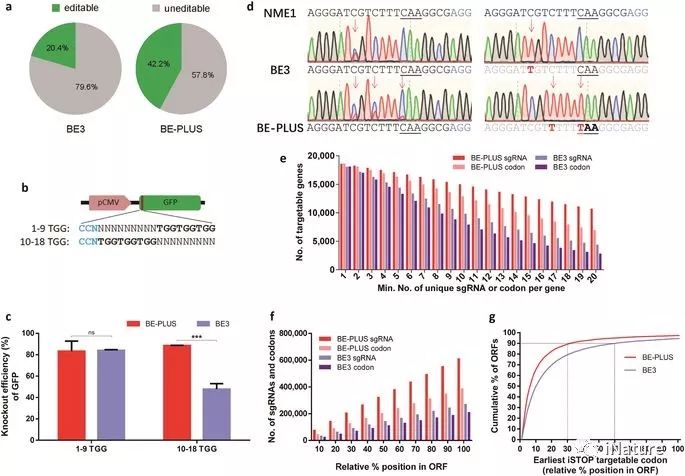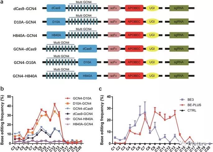 包含胞苷脱氨酶和催化缺陷的Cas9的基本编辑器(BE)已被广泛用于碱基编辑。 但是,BE的窄的编辑窗口限制了它的实用性。 在这里,研究人员开发了一种新的编辑技术,通过将10个拷贝的GCN4肽融合到nCas9(D10A)中,将scFv-APOBEC-UGI-GB1引入到编码更大的C到U(T)范围(BE-PLUS) 。 新系统通过扩大窗口实现基础编辑,从而提高了基因组靶向范围。 有趣的是,新系统产生了更少的不必要的输入和非C到T转换。我们还通过诱导终止密码子(STOP),展示了它在整个基因组中的潜在应用。综合起来,BE-PLUS系统提供了一个新的编辑工具,增加了编辑窗口,提高了保真度。