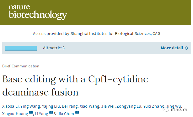 为了解决以上问题,上海科技大学陈佳研究组及黄行许研究组及上海生科院杨力研究组合作通过将大鼠胞嘧啶脱氨酶APOBEC1融合到无催化活性的Lachnospiraceae细菌Cpf1上,开发了基于CRISPR-Cpf1的碱基编辑工具。 碱基编辑器可识别富含T的PAM序列,并催化人类细胞中的C至T转换,同时诱导低水平的插入缺失,非C至T替换和脱靶编辑。