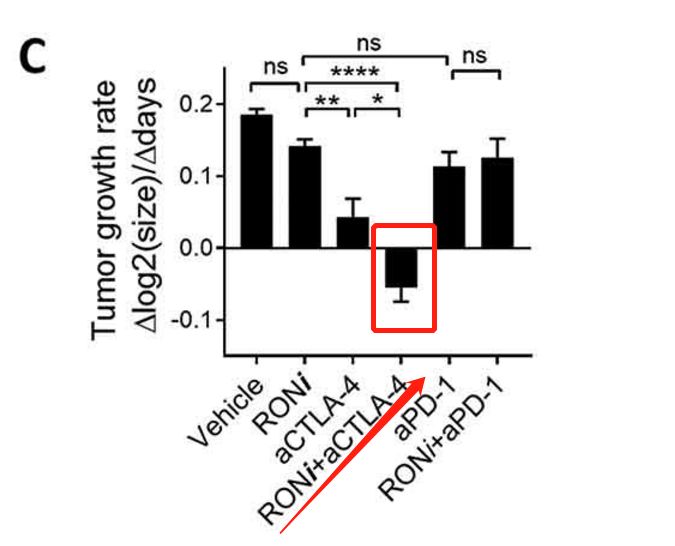 在最后RON和CTLA-4联合治疗组不仅有效的控制住了肿瘤的生长,将它抑制在一个的水平,效果也比单用CTLA-4好多了: