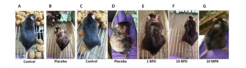 而如果在小鼠20到36周龄时,给它们喂食不同剂量的D-PDMP化合物,每天每公斤体重喂食1毫克和10毫克D-PDMP的小鼠毛发出现了奇迹般地生长!