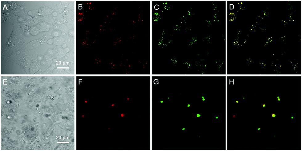 (A-D)Hela 细胞和(E-H) 肝组织活体分别用MeOTTMN(第二列)和黄连素(第三列)染色的共聚焦荧光成像:明场(第一列)及合并图像(第四列)