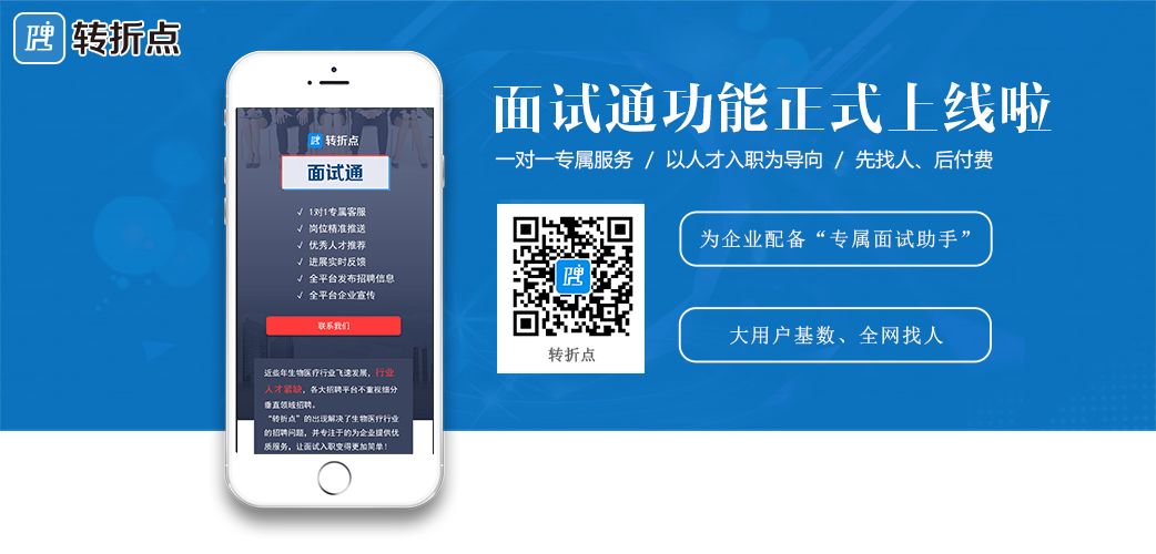 “转折点”专注于生物医药求职招聘,致力于生物医药行业人才的发展,专注于线上解决生物医药企业发展过程中遇到的招聘问题。