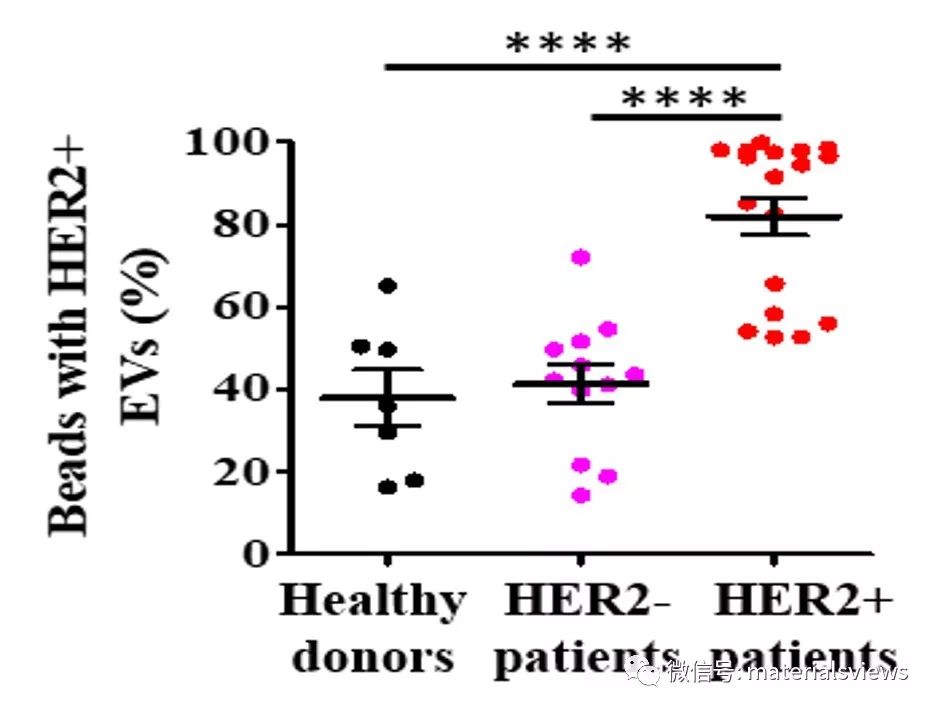 由于细胞外囊泡的纳米尺寸超出流式细胞术的检测极限,通过将细胞外囊泡富集在醛基化乳胶微球上并借助抗体的特异性识别,实现了对细胞外囊泡表面特定蛋白分子检测信号的放大,从而可通过流式细胞术对细胞外囊泡-微球复合物进行检测和分析。利用该方法对乳腺癌患者血清细胞外囊泡中两类重要的肿瘤相关蛋白标志物上皮细胞黏附分子(EpCAM)和人类表皮生长因子受体2(HER2)的表达量进行了检测,证明外泌体标志蛋白的表达量可有效反映来源细胞标志蛋白的表达状态。EpCAM和HER2阳性外泌体可有效用于乳腺癌的诊断和HER2分子分型,受试者工作特征曲线(ROC)显示曲线下面积高达0.972,证明了该方法的高灵敏度性和高特异性。除此之外,该方法对乳腺癌进行HER2分子分型的结果与临床“金标准”免疫组化的结果呈现出高度的一致性,进一步验证了该方法的准确性。该工作提供了一种非侵入性、低成本、快速的肿瘤诊断和分子分型方法,可应用于肿瘤早筛、实时监测、预后判断、疗效评价等领域,推进精准医疗的进程。