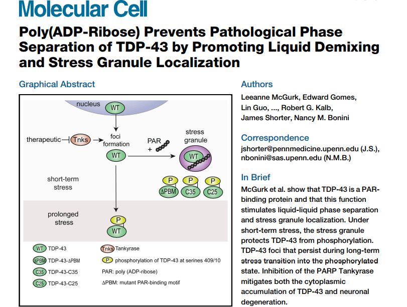肌萎缩侧索硬化ALS是运动神经元疾病,病程晚期进展为全身肌肉萎缩和吞咽困难,最后产生呼吸衰竭,TDP-43是一个重要的致病相关蛋白,宾夕法尼亚研究小组发现PARP抑制剂可以阻止 PAR的产生,从而减少TDP-43的有害影响,此项研究发表在《Molecular Cell》上。