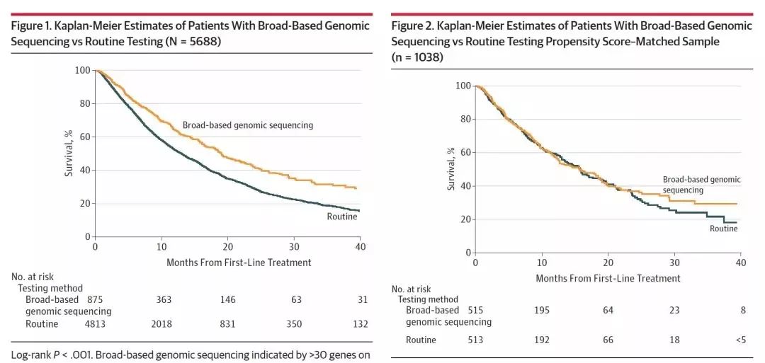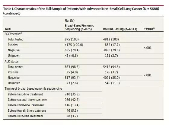 这是一项回顾性队列研究,采用Flatiron健康数据库来筛选诊断为IIIB/IV其或复发性非鳞晚期NSCLC患者,接受广谱基因测序或常规基因检测(EGFR/ALK检测)并接受一线抗肿瘤治疗。广谱基因测序包括任何的多基因检测panel,覆盖30多个基因。主要研究终点为从接受一线治疗开始的12个月的病死率。在倾向性评分匹配生存分析中,主要研究终点为OS,定义为开始一线治疗至死亡或最后随访时间。最后随访时间为2016年7月31日。次要研究终点为特定基因变异的发生率和患者接受的治疗。