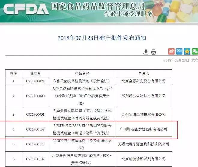 | 导读 | 7月23日,广州燃石医学检验所宣布获得CFDA批准基于高通量测序(NGS)以及伴随诊断标准审批的多基因突变联合检测试剂盒(EGFR/ALK/BRAF/KRAS基因突变联合检测试剂盒可逆末端终止测序法),将用于帮助非小细胞肺癌患者精准选择靶向药物治疗。8月13日,CFDA通过创新医疗器械特别审批通道,批准了诺禾致源人EGFR/KR |