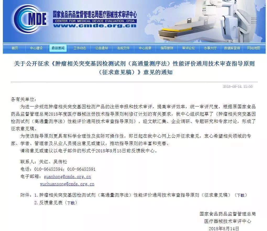 8月14日,为进一步规范肿瘤相关突变基因检测产品的注册申报和技术审评,提高审评效率,统一审评尺度,国家食品药品监督管理总局和医疗器械技术审评中心发布关于公开征求《肿瘤相关突变基因检测试剂(高通量测序法)性能评价通用技术审查指导原则(征求意见稿)》意见的通知。
