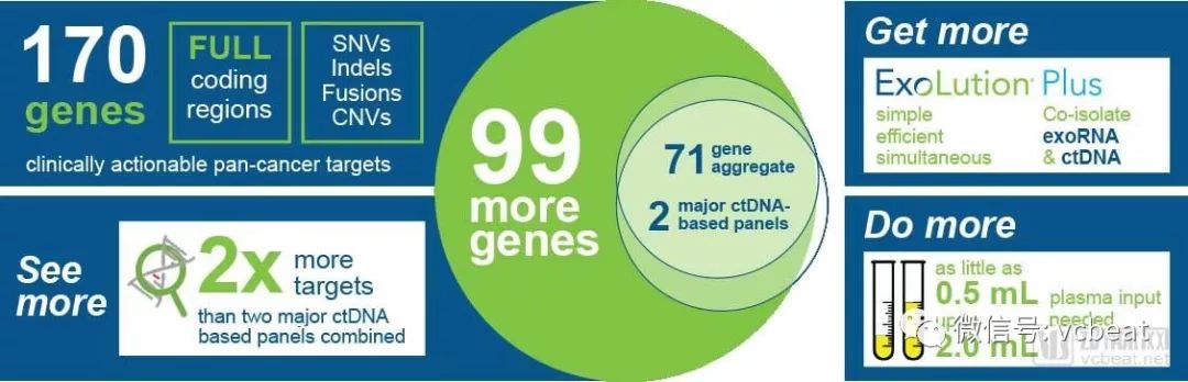 2017年8月,ExosomeDX推出了全新的广谱检测产品,MedOncAlyzer 170。此款产品利用血液/血浆中的外泌体RNA和循环肿瘤DNA,对肿瘤相关基因的功能性突变进行检测。