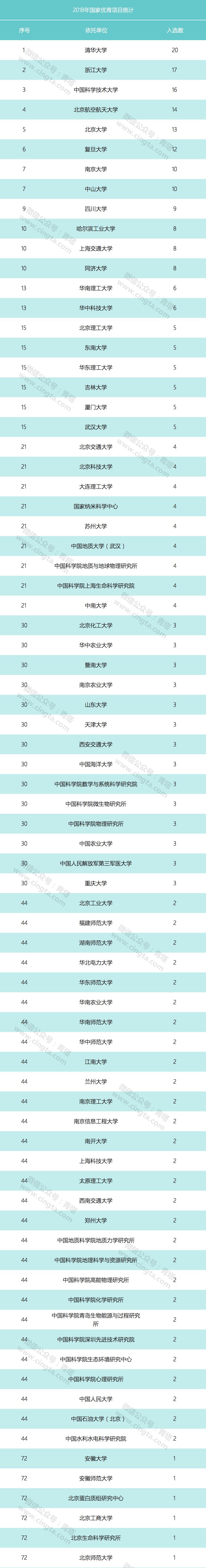 从统计数据来看,入选人数排名前5的高校单位分别是:清华大学20人、 浙江大学17人、中国科学技术大学16人,北京航空航天大学14人,北京大学13人。此外,复旦大学、南京大学、中山大学等高校都入选申请人都超过10名,表现不俗。下面是各单位的立项数和2018年国家优青获得者名单: