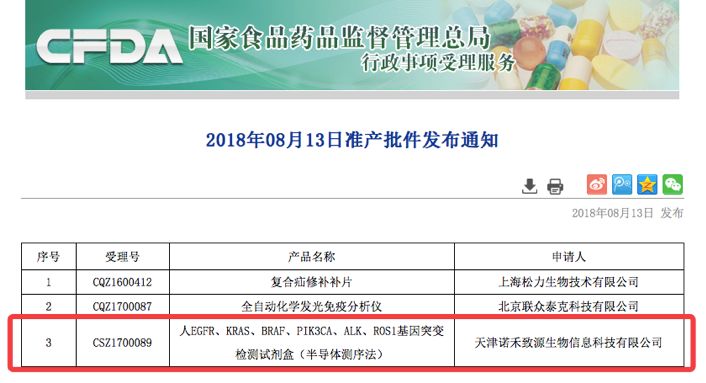 2018年8月13日,天津诺禾致源生物信息科技有限公司的III类医疗器械创新产品“人EGFR、KRAS、BRAF、PIK3CA、ALK、ROS1基因突变检测试剂盒(半导体测序法)” 通过了国家药品监督管理局的审批,正式获准上市销售。该产品此前已获创新医疗器械特别审批通道资质。该产品批准用于检测非小细胞肺癌(NSCLC)患者肿瘤组织FFPE样本中与靶向治疗密切相关的六个基因的突变状态,筛选适合接受靶向药物治疗的患者。