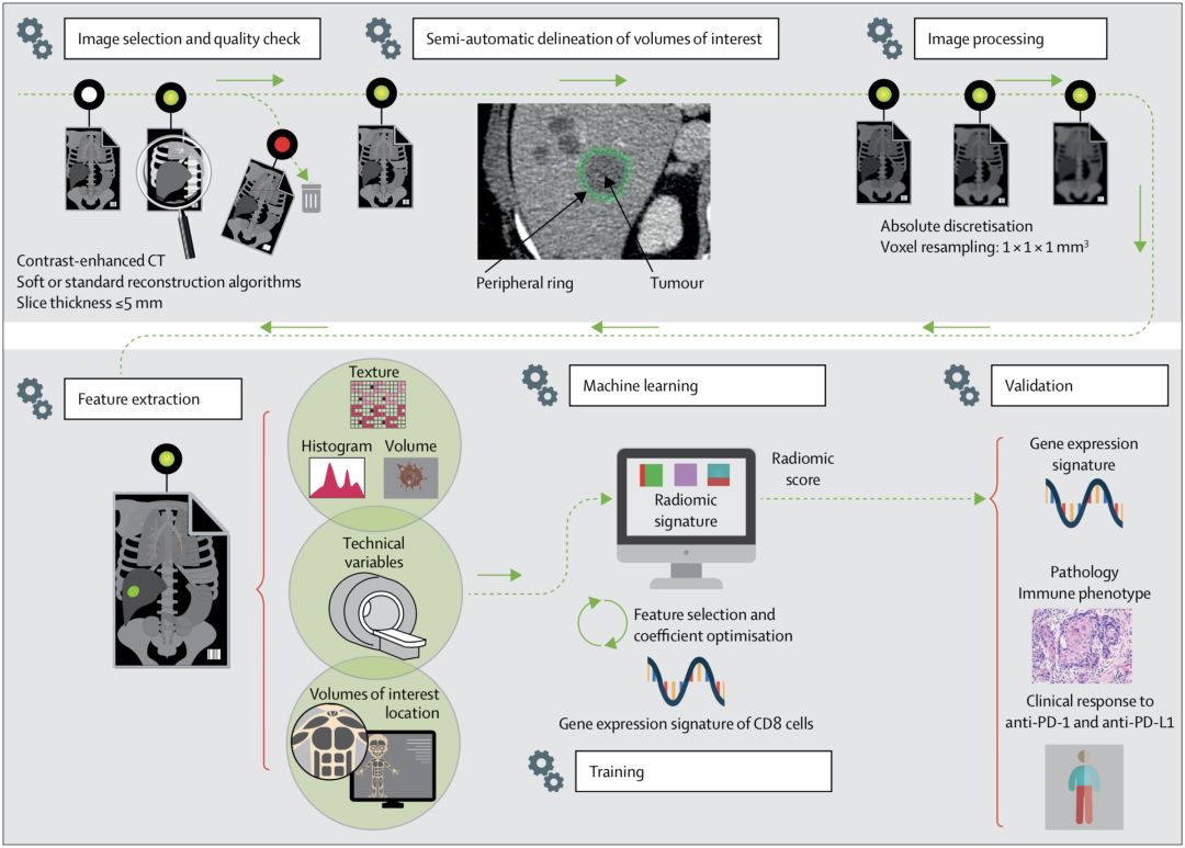 也就是说,Deutsch博士团队直接想从患者肿瘤组织的CT影像上看出肿瘤里面的免疫细胞水平,然后预测患者对免疫治疗响应的程度。