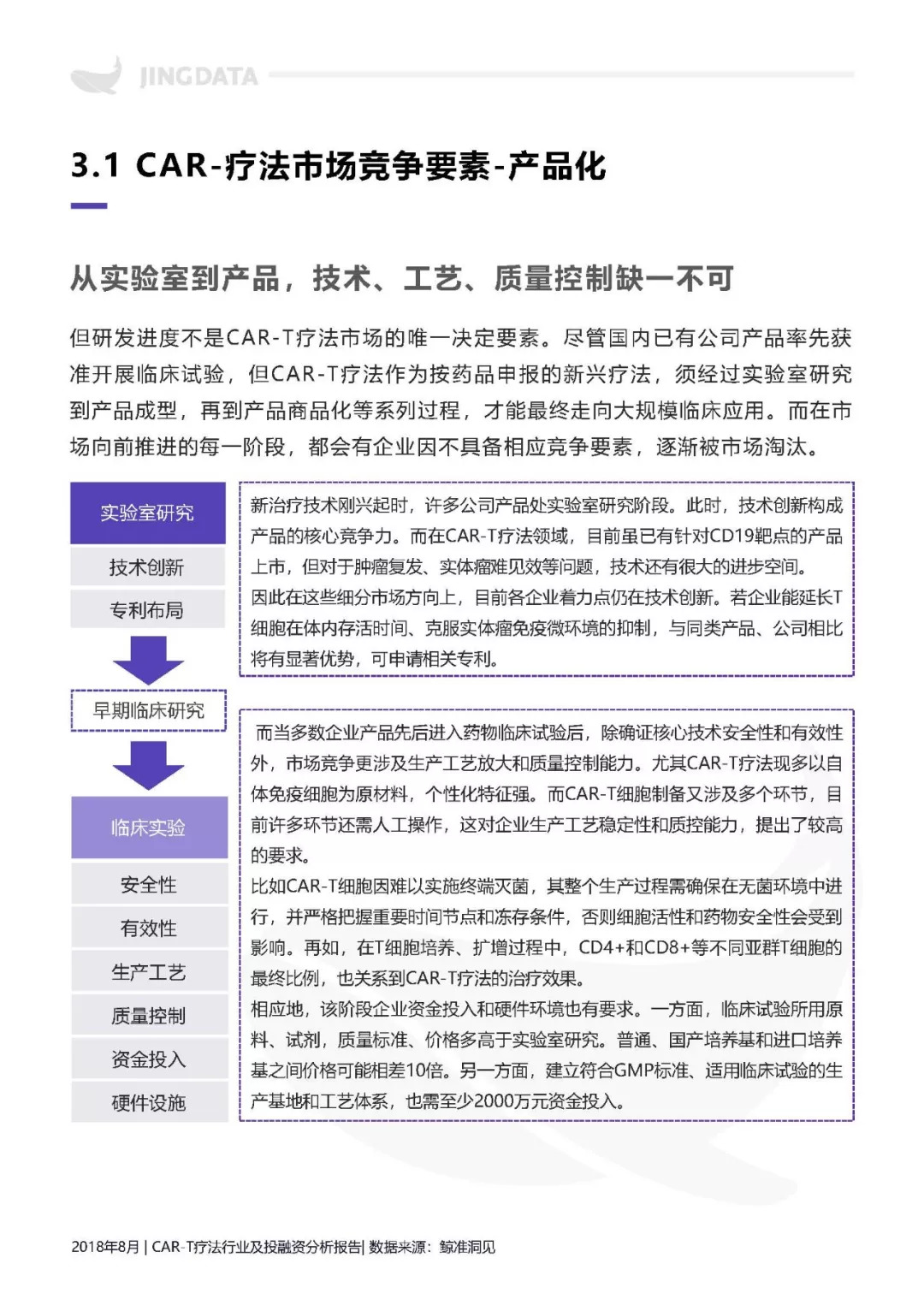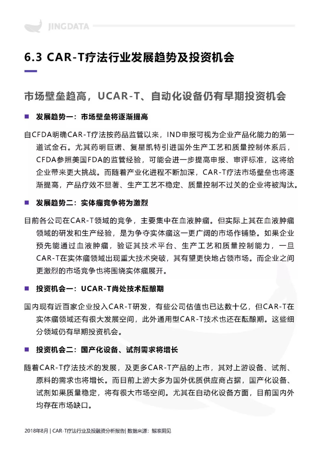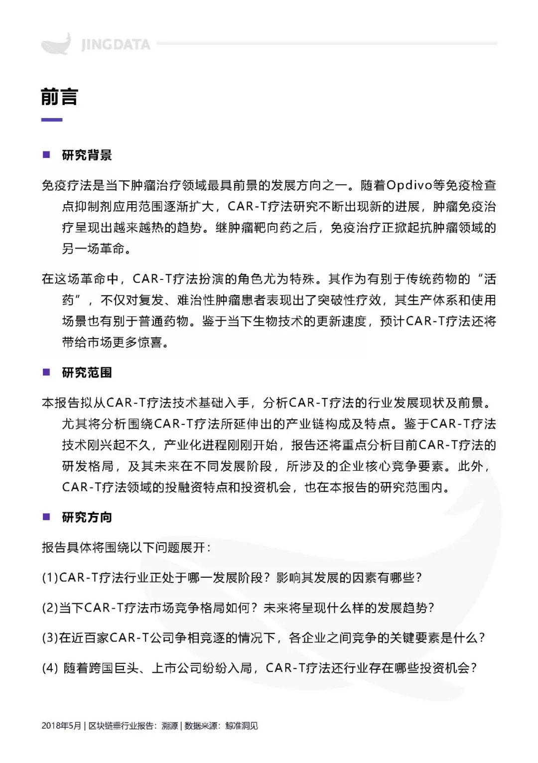 本报告拟从CAR-T疗法技术基础入手,分析CAR-T疗法的行业发展现状及前景。尤其将分析围绕CAR-T疗法所延伸出的产业链构成及特点。鉴于CAR-T疗法技术刚兴起不久,产业化进程刚刚开始,报告还将重点分析目前CAR-T疗法的研发格局,及其未来在不同发展阶段,所涉及的企业核心竞争要素。此外,CAR-T疗法领域的投融资热点和投资机会,也在本报告的研究范围内。
