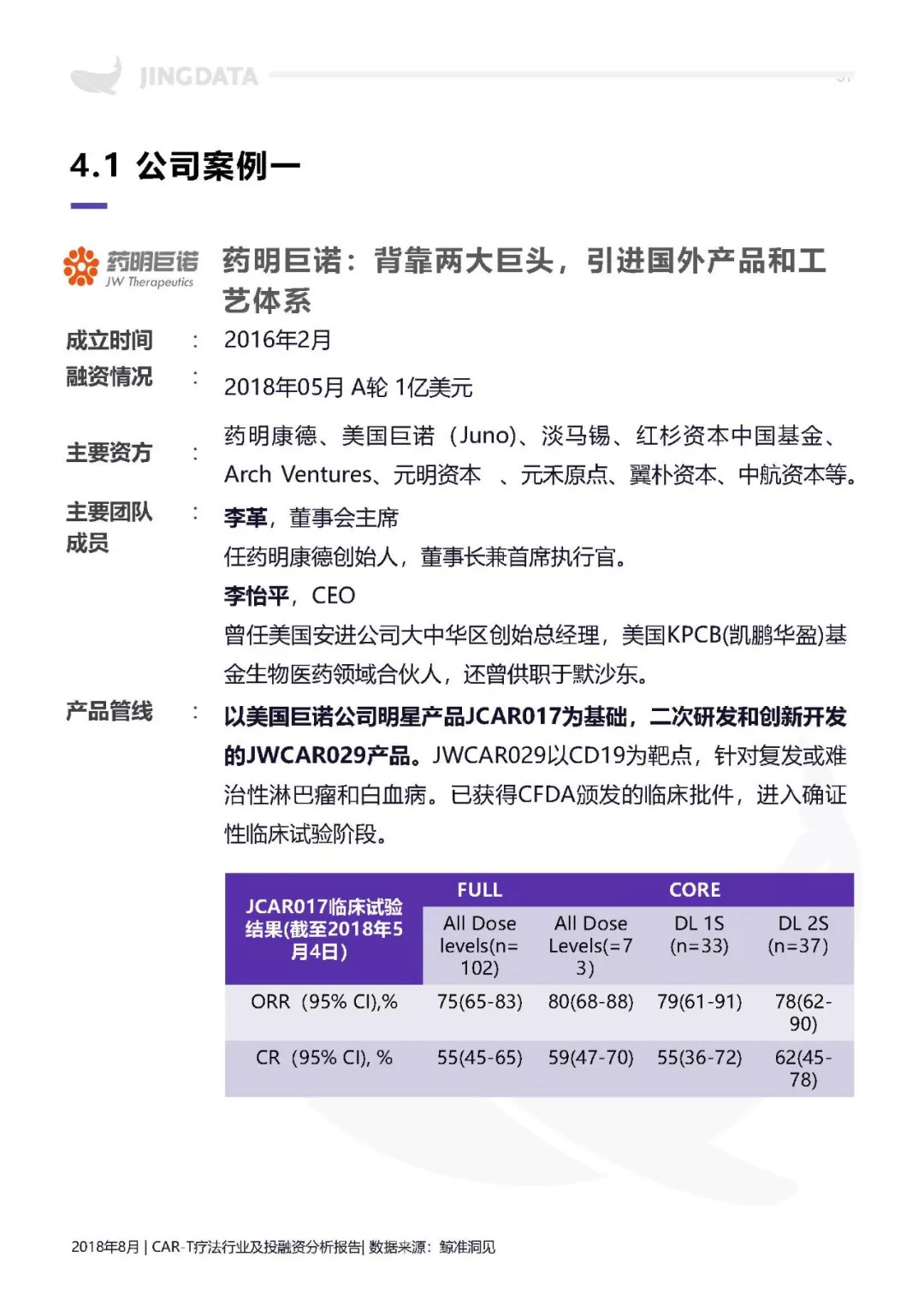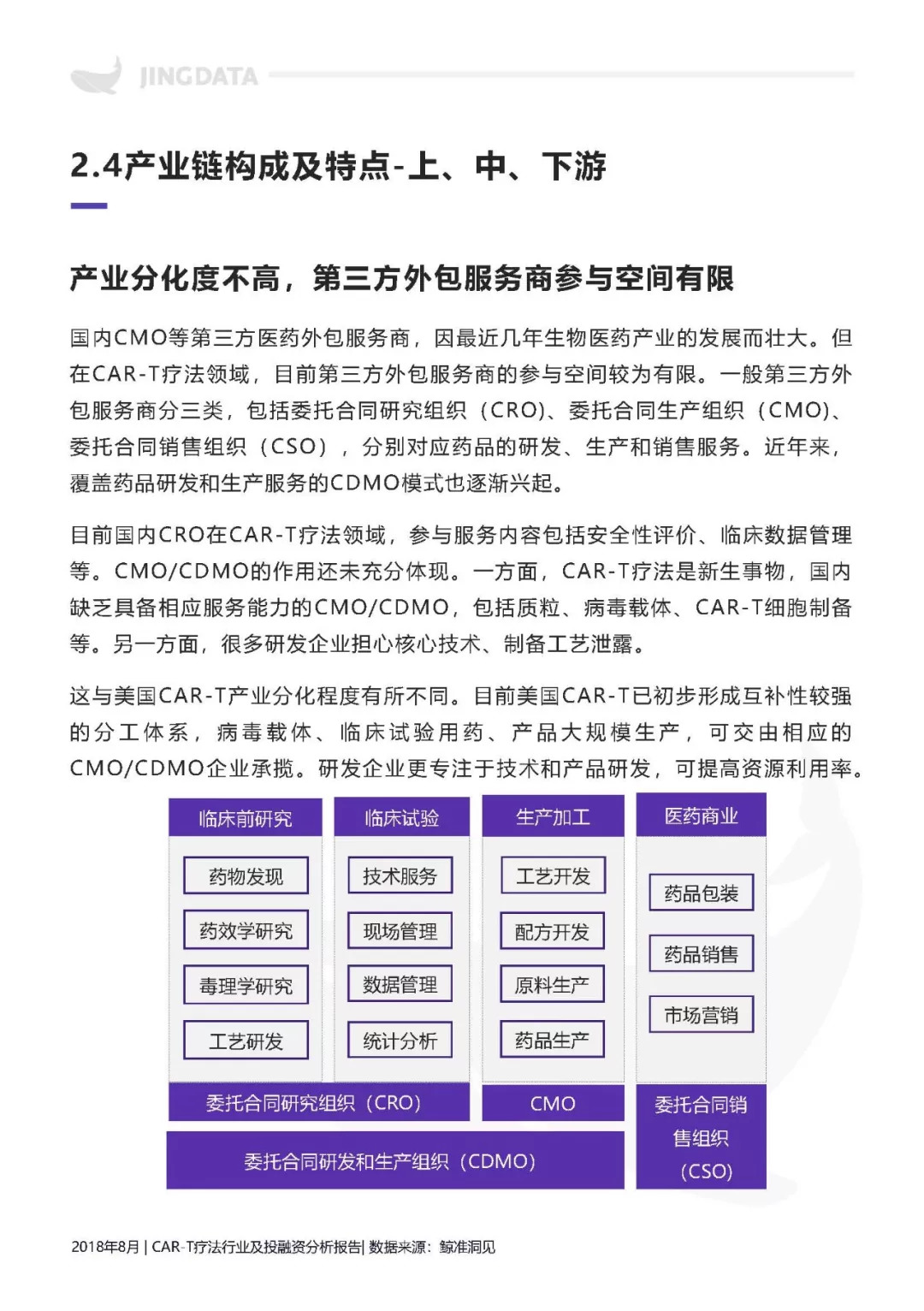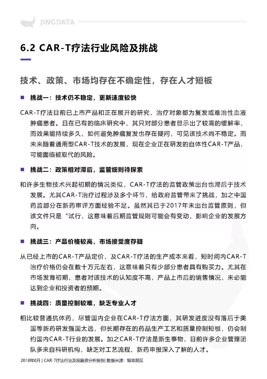 本报告拟从CAR-T疗法技术基础入手,分析CAR-T疗法的行业发展现状及前景。尤其将分析围绕CAR-T疗法所延伸出的产业链构成及特点。鉴于CAR-T疗法技术刚兴起不久,产业化进程刚刚开始,报告还将重点分析目前CAR-T疗法的研发格局,及其未来在不同发展阶段,所涉及的企业核心竞争要素。此外,CAR-T疗法领域的投融资热点和投资机会,也在本报告的研究范围内。