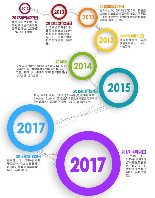 1、2014年4月获批单药治疗含氟脲嘧啶或铂剂化疗进展的进展期 / 转移性胃癌或胃食管结合部腺癌。