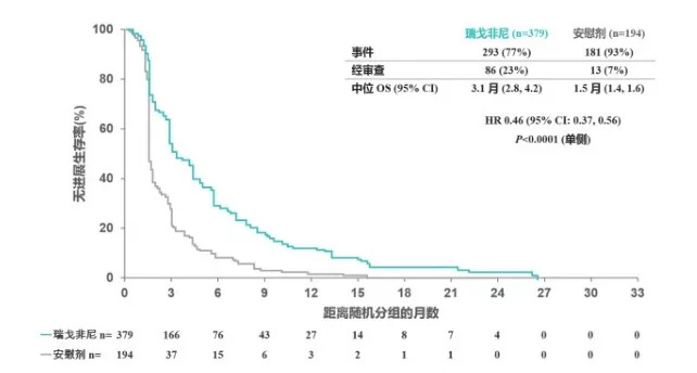无进展生存期(PFS)方面瑞戈非尼组同样具有显著优势(中位 PFS 3.1 个月 vs. 1.5 个月,P<0.0001),以上治疗获益在所有预先界定的亚组中均得以维持。此外,经瑞戈非尼治疗的患者还具有更高的缓解率和疾病控制率。