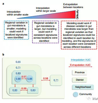在表型中,寄主的地理位置与微生物区系变异的相关性最强。在一个地方开发的基于微生物的代谢性疾病模型在其他地方使用失败,这表明这类模型不能以此类推。插值模型的效果要好得多,特别是在具有明显微生物相关特征的疾病中.插值效率随着地理尺度的增加而降低,这表明需要建立本地化的基线和疾病模型来预测代谢风险。